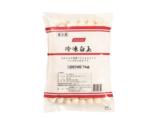 滑らかな口あたりが特長の白玉です。自然解凍または流水解凍でご使用いただけます。ボイル・流水・電子レンジなどで解凍してください。常温(約25℃)で自然解凍(90分程度)してください。(調理例)冷凍白玉を必要数量熱湯に入れて加熱し、白玉全体が浮き上がってきたら冷水にとって冷やしてください 同製造ラインにて大豆を使用した製品の製造を行っております。