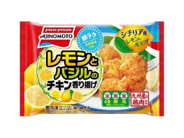 シチリア産レモンとバジルの風味がさわやかな、冷めても柔らかい鶏のから揚げです。九州産鶏肉を使用しています。「小麦・卵・乳」不使用です。自然解凍可能です。