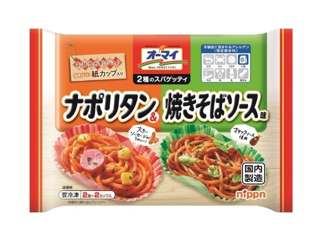 人気の2種の味が楽しめるアソートタイプのお弁当スパゲッティ。卵・乳・えび不使用。便利な紙カップ入り。