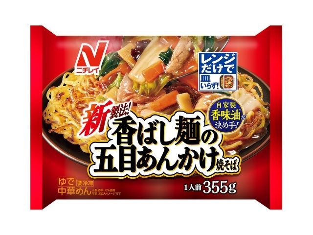 電子レンジで調理する五目あんかけ焼そばです。香ばしく焼いた麺と6種類の具がたっぷり入ったこだわりのあんが特長です。