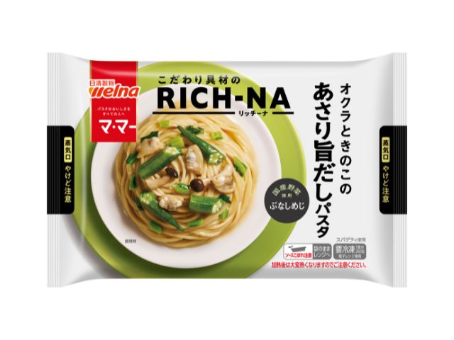 こだわりのメニュー&具材でリッチな気分"マ・マー RICH-NA"。オクラ、あさり、国産ぶなしめじをトッピング。あさりのだしが溶け込んだ旨み豊かな味わいが口いっぱいに広がります。袋のままレンジ調理が可能なうえ、お皿がいらない便利な紙トレイ入りなので、調理も片付けもカンタン!