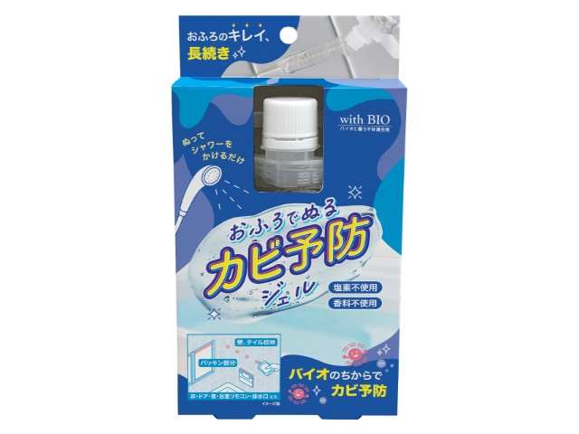 浴室の壁やタイルの目地などのカビが生えやすい場所に塗れるジェルタイプの防カビ剤。シャワーをかけるとジェルからバイオが溶け出しカビを予防します。固めのジェルは垂れてくる心配がなく、壁に使いやすいです。