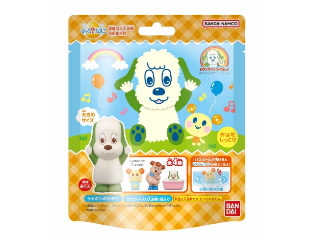 マスコットが入った球型の入浴剤です。シャボンの香りがする入浴剤でお湯に溶けると水色のお湯になります。ラインナップ全4種類です。