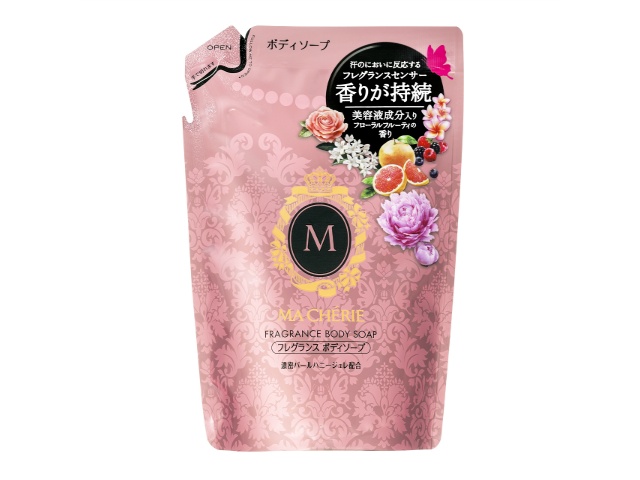 心地よい香りと、うるおいつや肌の毎日を。マシェリ独自のフレグランスセンサー機能で不快なにおいを心地よい香りにするボディソープ。うるおい成分 濃密パールハニージュレBX*配合で、うるおいつや肌に仕上げます。成分を厳選したマシェリの肌へのこだわり。*パールコンキオリン**・ハチミツ・ヒアルロン酸Na・セリシン。**加水分解コンキオリン。つめかえ用、甘くさわやかなフローラルフルーティの香り