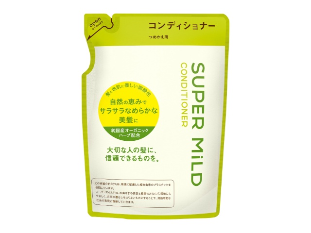 自然の恵みを蓄えた純国産オーガニックハーブ配合エッセンス*が、髪を芯からサラサラなめらかな美髪にするコンディショナー。髪と地肌のうるおいを守る弱酸性。*毛髪保湿成分:カミツレ花エキス、ローズマリーエキス、DPG、ソルビトール、BG。つめかえ用、自然のすがすがしい風を感じるような、グリーンフローラルの香り、(販売名:スーパーマイルド コンディショナーA f)