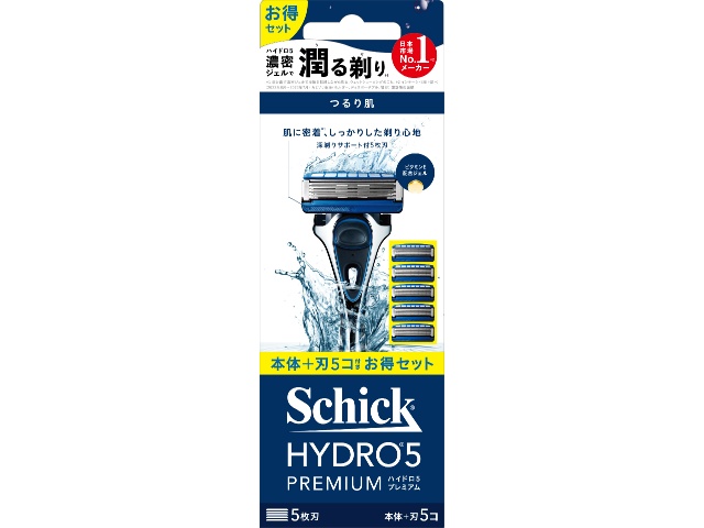 肌を守りながら剃る、スキンケアシェービングのハイドロシリーズ。ハイドロ5プレミアムホルダー(刃付き)に替刃4コが付いたお得なパック。