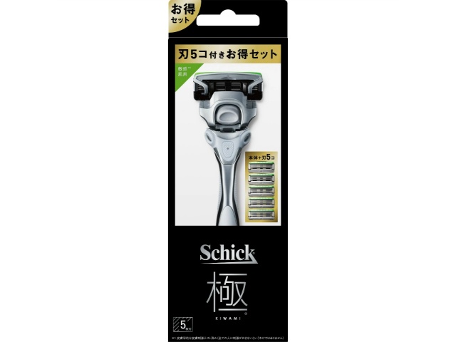 ハンドルに衝撃吸収テクノロジーを採用したシック最高峰モデル*、キワミホルダー敏感肌用(刃付き)に替刃4コが付いたお得なパック。(*ハンドルの衝撃吸収機能によるシック史上最高の剃り心地)