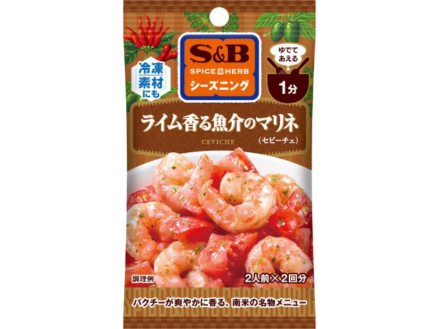 簡単調理でステキなメニューができる、SPICE&HERBシーズニング。ゆでたえび、トマトとあえるだけで、南米の名物メニュー、セビーチェ風の冷菜が作れます。パクチーとライムが効いた爽やかな味わいです。