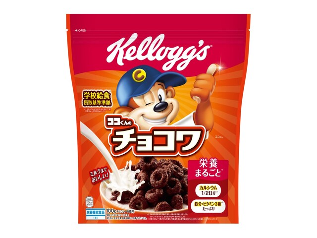 丸い形が楽しい、サクサク食感のチョコシリアル。学校給食摂取基準に準拠したビタミンミネラル(ビタミンAB1B2Cカルシウム鉄)が摂れる、栄養まるごと*1のシリアル。1/2日分のカルシウム
