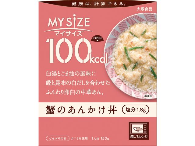 1人前100kcalの蟹のあんかけ丼。白湯とごま油の風味に鰹と昆布の白だしを合わせたふんわり卵白の中華あん。健康は、計算できる。おいしく続けられるカロリーコントロール。ラインアップ豊富な100kcal