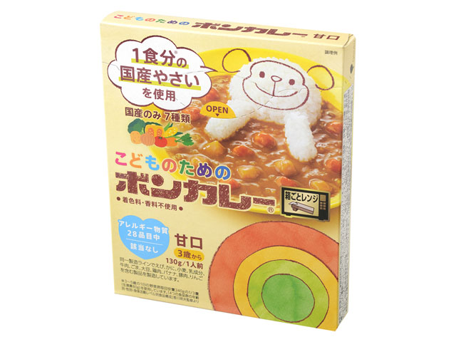 1食分※の国産野菜を使用。国産野菜7種類の甘みと旨みがとけこむ、まろやかな甘口カレーです。3歳ごろから食べられます。※3〜5歳の1日の野菜摂取目安量240gの1/3量(生換算80g)を使用しています。