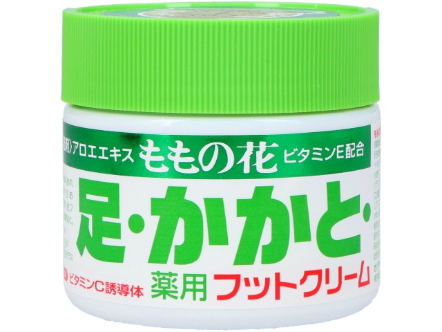 ももの花・薬用フットクリームはかかとのケアに最適なクリームです。アロエキス・ビタミンEおよびC誘導体・アラントイン配合により、乾燥によるひび・あかぎれ・あれ性・肌あれを防ぎ皮膚を保護いたします。お風呂あがり・おやすみ前にたっぷりつけ、よくマッサージしますと効果的です。ひじ・ひざのお手入れにもお使いください。