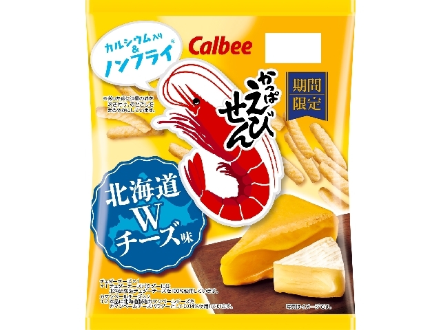 北海道製造のチェダーチーズとカマンベールチーズ、2種類のチーズを使用したコク深い味わい。えびの風味と合わさって、やめられない、とまらない♪おいしさです。