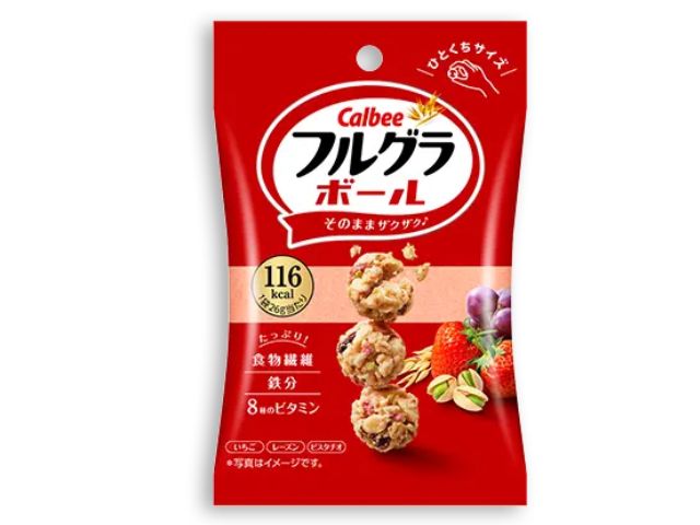 ひとくちサイズでまるいフルグラ。健康的なおいしい間食で、小腹満たしにぴったりです。1粒ごとに穀物のザクザク感とフルーツの甘酸っぱさが味わえる。