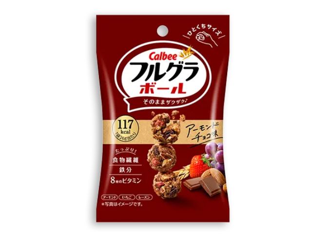 ひとくちサイズでまるいフルグラ。健康的なおいしい間食で、小腹満たしにぴったりです。1粒ごとにチョコの甘さとアーモンドの香ばしさ、いちごの甘酸っぱさが味わえる。人気のアーモンド&チョコ。