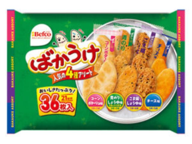 レギュラーのばかうけ青のり・ごま揚しょうゆ・中までチーズに、甘口しょうゆと甘口カレーをミックスしたばかうけのアソートです。