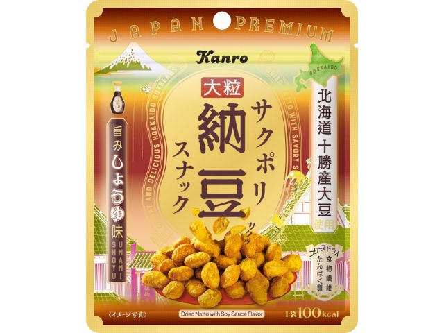 北海道十勝産大粒大豆がふっくら美味しい、サクッと手軽に食べられる納豆スナックです。北海道十勝産。ふっくら美味しい大粒です。