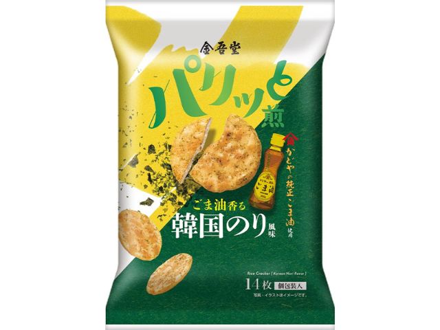 ごま油の香ばしさと 絶妙な塩加減の韓国のり風味に、唐辛子でほんのりとした辛みを加えたうすやきタイプのお煎餅です。