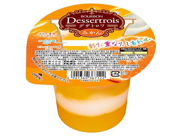 彩り豊かな3層のゼリーで、みかん果肉入りのゼリーが、まろやかで少し固めな食感のヨーグルト味ゼリーや、とろっと濃厚なみかん味ソースと出会うことでみかんゼリーの新たなおいしさを引き出します。