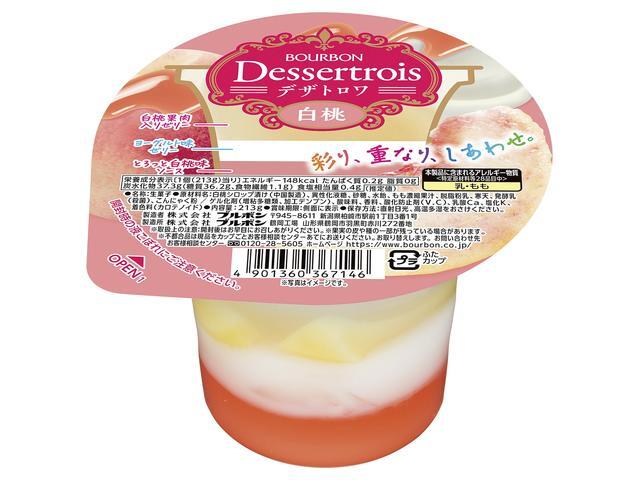 彩り豊かな3層のゼリーで、白桃果肉入りのゼリーが、まろやかで少し固めな食感のヨーグルト味ゼリーや、とろっと濃厚な白桃味ソースと出会うことで白桃ゼリーの新たなおいしさを引き出します。