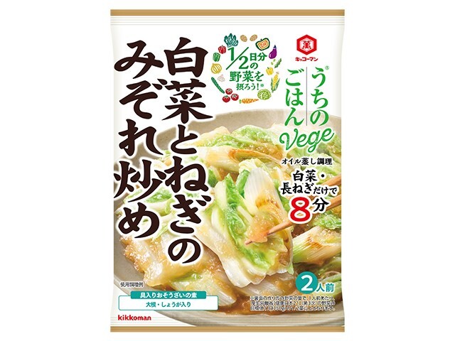 野菜だけ(2種類使用)でメインのおかずが出来上がり、1食で1日に必要な野菜350gの1/2相当(175g)が摂れます。白菜、長ねぎだけで8分でできる、野菜が主役のおそうざいの素です。