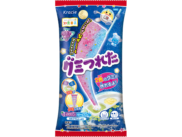 人気の駄菓子です。ストローでつり上げると2色のながいグミができる手作りお菓子