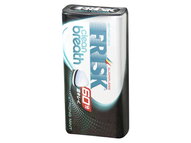 【中身)三角形タブレットの3層構造。中間層に緑茶抽出物を配合。【外見】爽快感と清潔感を訴求するデザイン。商品特長で優位性がある「60分息キレイ」をパッケージ前面で日本語で明確に訴求。