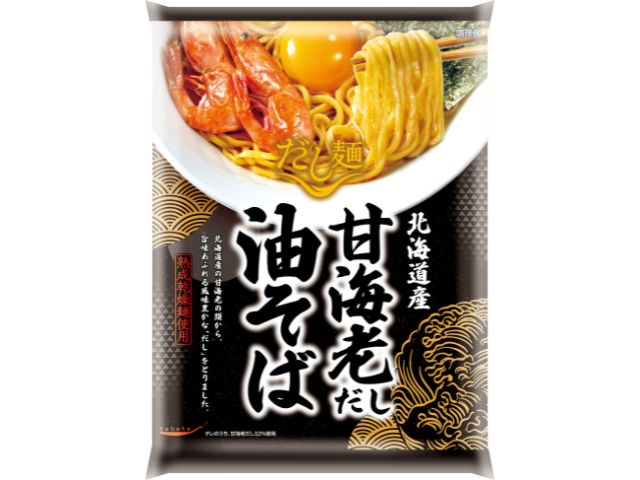 国産素材の「だし」のうまみが効いたラーメン「だし麺」。シリーズから初めての油そばになります。北海道産甘海老の頭からとった「だし」を使用したタレが太麺タイプの熟成乾燥麺と良く絡み合います。麺は、生麺を約2日じっくりと時間をかけて熟成と乾燥させたコシのある生麺食感です。【ゆで時間・5分半】