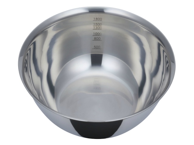 サビに強いステンレス製ボウルです。汚れや匂いが付きにくいステンレス素材。深型で材料がこぼれにくく、混ぜやすい。料理の手間を省ける、容量目盛り付き。