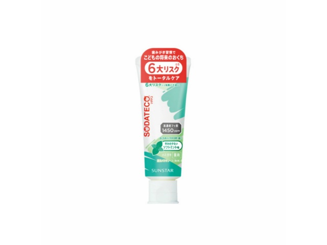 こどもの将来のおくち6大リスク※を防ぐために、歯みがき習慣でお子さまのおくちをトータルケア。高濃度フッ素1450ppmと還元パラチノース(助剤)配合。大人用のハミガキを使う前のお子さま向けに辛味の少ないソフトミント味。※:むし歯、着色、おくち全体の汚れ、歯石、歯垢、口臭/15才以下のこどもの親が、近い将来(2〜3年)気になりそうな、歯みがき不足によるこどものおくちトラブル(当社調べ)