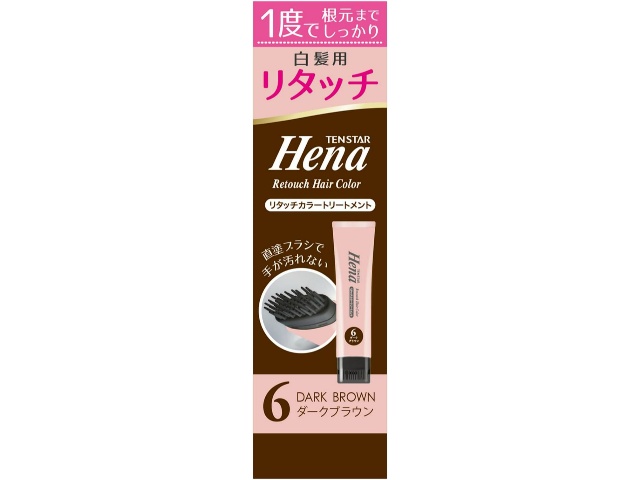 簡単リタッチ、部分白髪用カラートリートメント。直塗りブラシで、手を汚さずに、気になる分け目・生え際の白髪をリタッチできます。放置時間5分。オリジナルヘナ葉エキス配合。特許技術「ミクロカラーコート処方」採用。無香料