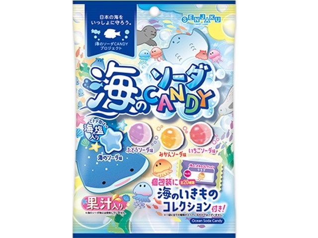 長崎県五島灘の海塩使用。3種類のソーダアソート。外装は全3種類、個装には全20種類の「海のいきものコレクション」付き。