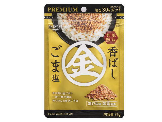 希少な金ごまを贅沢に使用し、ごま一粒一粒にしっかりと味をつけたこだわりのごま塩です。海水と海藻の旨味を凝縮し、ミネラル豊富なこだわりの瀬戸内産の藻塩を使用しています。金ごまの芳醇な香りと、まろやかな口あたりです。