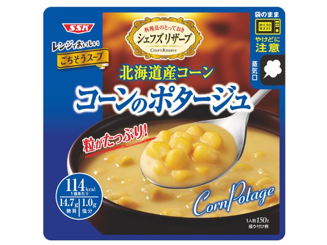 甘みと風味の強い北海道産スイートコーンをたっぷり使用した食べごたえのある粒入りコーンポタージュです。主要な原料(コーン・たまねぎ・生クリーム、濃縮乳)は北海道産に拘りました。旬の時期に収穫された北海道産コーンを自社工場で丁寧にすり潰し、粒もたっぷり入れた看板商品です。従来品の美味しさを維持したままクリーンラベル化を実現。コーンの優しい風味を更に引き立たせました。袋のまま電子レンジで温めるだけでいつでも本格的なコーンポタージュをお楽しみいただけます。