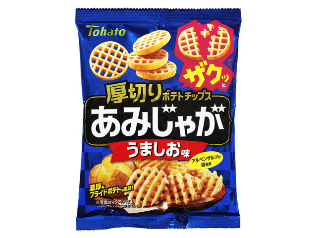 濃厚なフライドポテトの風味をお楽しみ頂けるあみ形状の厚切りポテトチップスです。アルペンザルツの塩を使用したマイルドなうましお味に仕上げました。