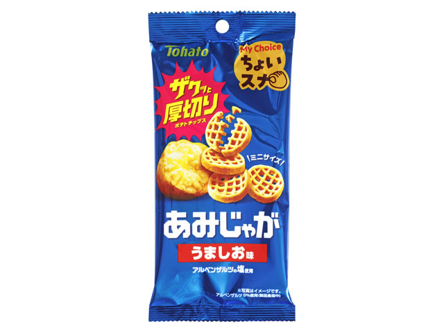 いつでもどこでも手軽にちょいとつまめるスナック「ちょいスナ」サイズのあみじゃが うましお味です。厚切りゆえのザクッと食べごたえある食感と、香ばしいフライドポテトの風味をお楽しみ頂けます。