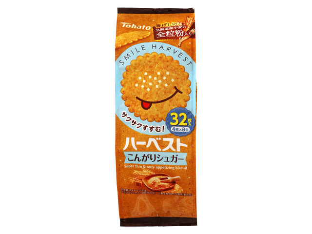 サクサクと軽快な食感の薄焼きビスケット、ハーベストの「こんがりシュガー」です。全粒粉とブラウンシュガーを生地に練り込み焼き上げ、こんがりと香ばしくコクのある甘みを感じる味わいです。