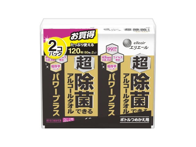 大王製紙 エリエール 超除菌できるアルコールタオル パワープラス ボトルつめかえ用60枚×2Px1