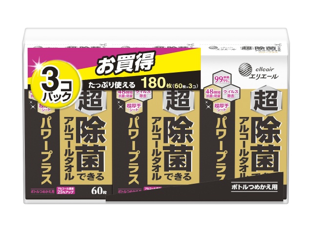 大王製紙 エリエール 超除菌できるアルコールタオル パワープラス ボトルつめかえ用60枚×3Px1