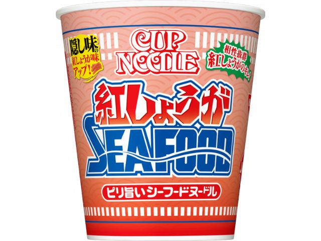 紅しょうがの爽やかなキレのある味わいと相性抜群のポークと、魚介のコクのあるシーフードヌードルスープが特徴的。具材はカニカマイカ紅しょうがチップキャベツスクランブルエッグネギ。