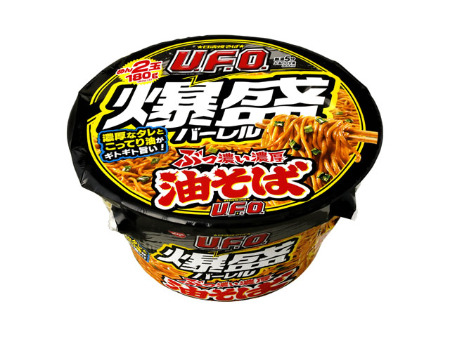 めん2玉(180g)で規格外の食べ応え!醤油味の濃厚なタレとこってり油がギトギト旨い油そば味のU.F.O.!具材はネギ!