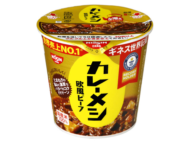 カレーメシビーフがリニューアル!バターの風味とスパイス感がアップし、さらに美味しい欧風ビーフカレーになりました。世界一売れている即席カップライスとしてギネス世界記録も獲得した一品をぜひご賞味ください。