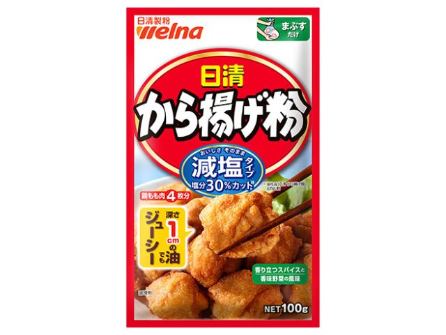 当社独自配合で、「日清 から揚げ粉」の美味しさそのままに、塩分を30%カット※しました。お肉にまぶして揚げる、手軽なまぶし調理タイプのから揚げ粉です。冷めてもジューシーな仕上がりです。深さ1pの油でも調理ができます。※「日清 から揚げ粉」の食塩相当量表示値との比較