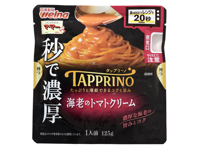 海老エキスや海老粉末をふんだんに使用し、海老の旨みとコクで仕上げたバランスのよい濃厚なトマトクリーム。袋のまま立てて電子レンジで温めるだけ。