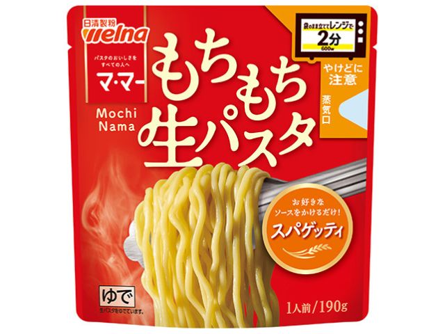 レンジで2分で調理ができる、もちもち食感の生パスタです。水も使わず、鍋も不要で簡単にもちもちした食感の生パスタをお楽しみいただけます。食べ応えのある太麺のスパゲッティで、濃厚なソースによく合います。