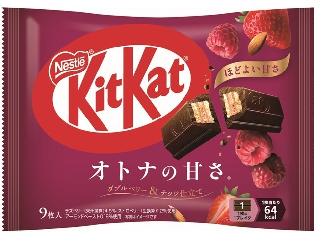 「キットカットオトナの甘さダブルベリー&ナッツ仕立て」は、いちごの粒入りのほどよい甘さのチョコレートと、ラズベリーパウダーとナッツペースト入りサンドクリームでサクッサクのウエハースを包みました。