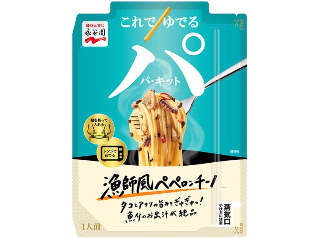 パウチの中にコップ一杯(160ml)の水とパスタを“パキッ”と折って入れ、電子レンジでチン(加熱)するだけで、パスタの茹でとソースの温めが同時にできる“パスタソース”です。※特許番号「7381803号」。“茹でたてのアルデンテ食感”が電子レンジ調理で実現できます。パスタの茹で汁を使ってソースを乳化させることにより、パスタとソースがよく絡みます。タコとアサリの旨みがぎゅぎゅっと詰まった魚介の出汁が絶品のペペロンチーノです。