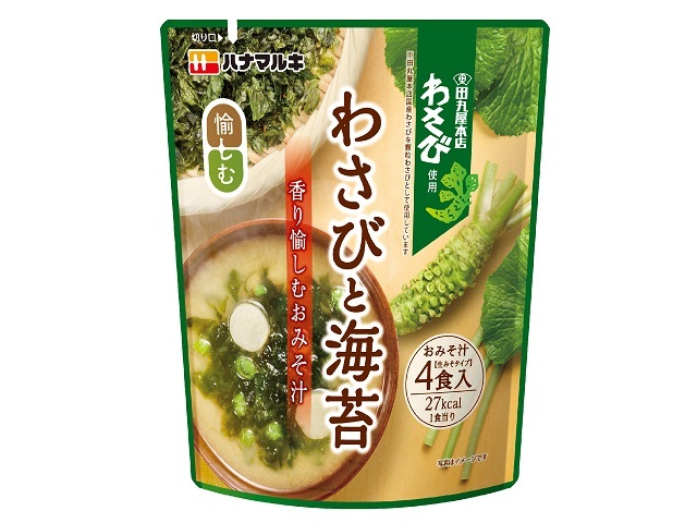 ツンと香るわさびの風味を効かせたおみそ汁。具材に海苔とわさび茎、麩を使用。1875年創業、わさびの老舗「田丸屋」の国産わさび顆粒を使用。わさびの香りと具材量アップしました。