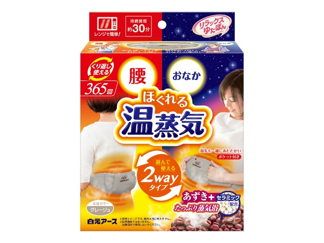 電子レンジでチンするだけで、心地よい温かさが約30分続きます。あずきとセラミックのたっぷり蒸気が腰やおなかを包み込み、じんわり温めます。指先も一緒に温められるポケットと結べるベルト付き。365回くり返し使えます。本体カラー:グレージュ