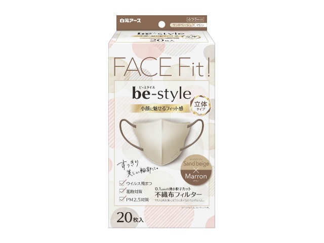 小顔に魅せるフィット感の女性用立体マスク。すっきりみせるスマートカット。メイクがつきにくくやさしい肌ざわり。0.1μmの微小粒子カットの不織布フィルター。マスクの色:サンドベージュ、耳ひも:マロン。